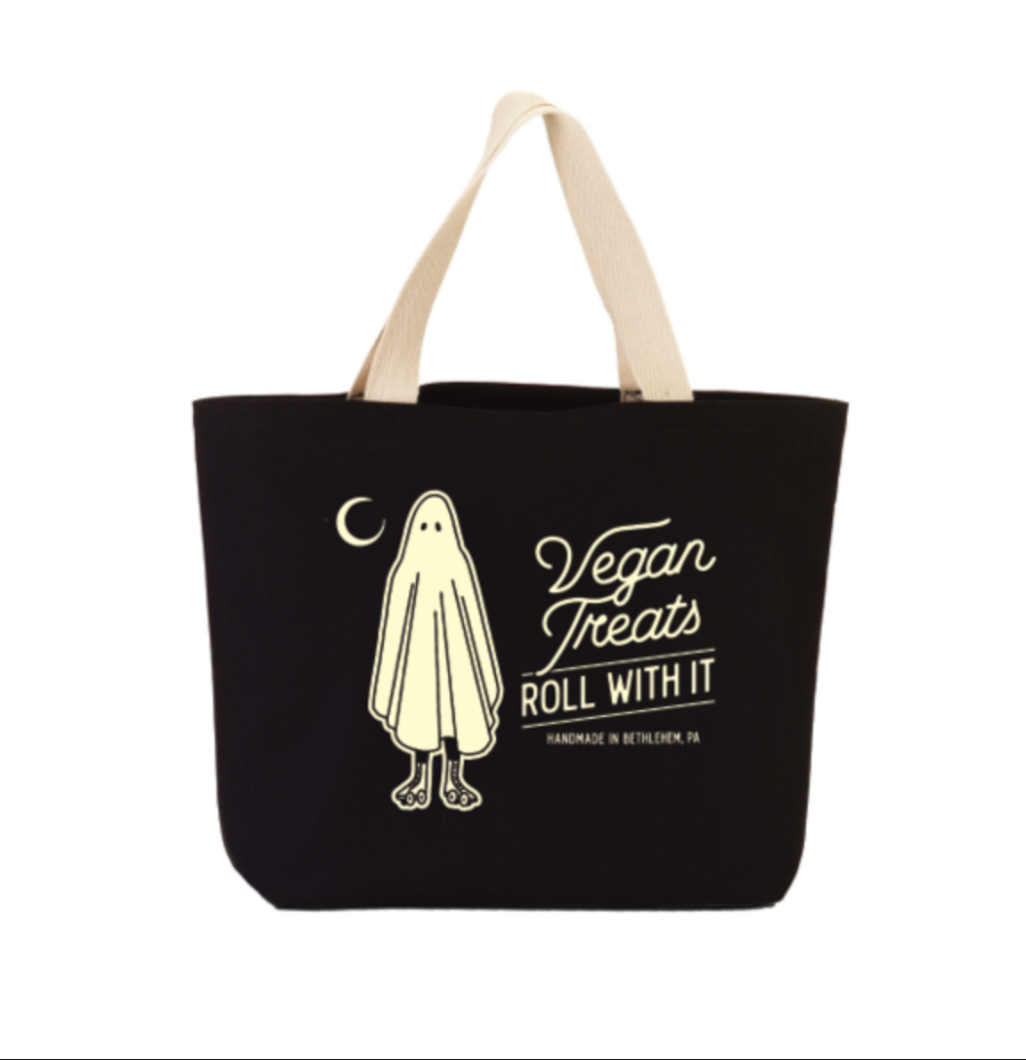Stow your backup sheet and your chocolate haul in this perfect ghost tote. This 14" x 19 1/2" x 5 1/4" bag is made of tight-weave cotton canvas for maximum durability. The design features a large main compartment with a 3" bottom gusset for extra room, and contrasted color 21" heavy cotton web handles.